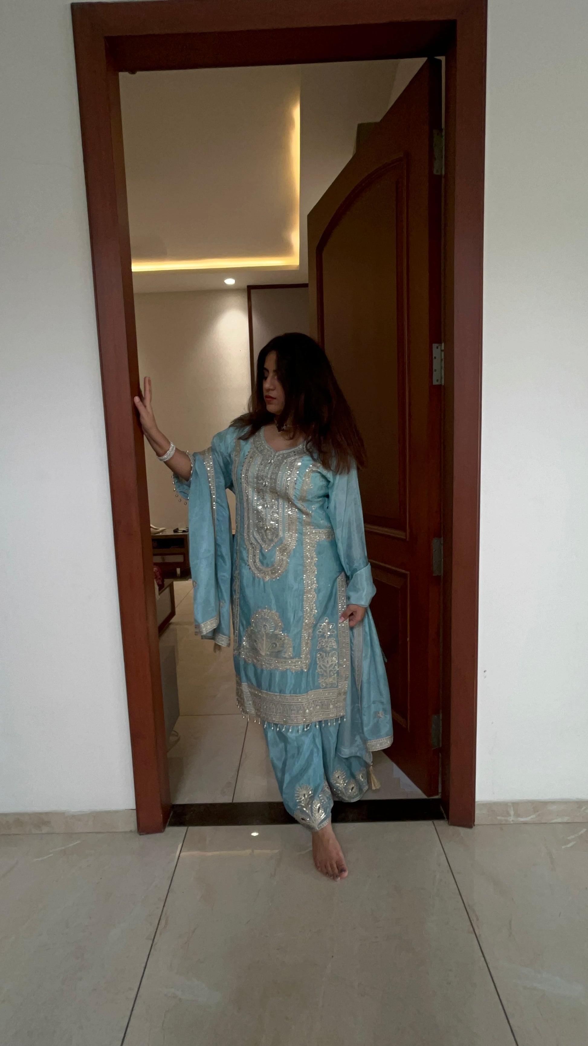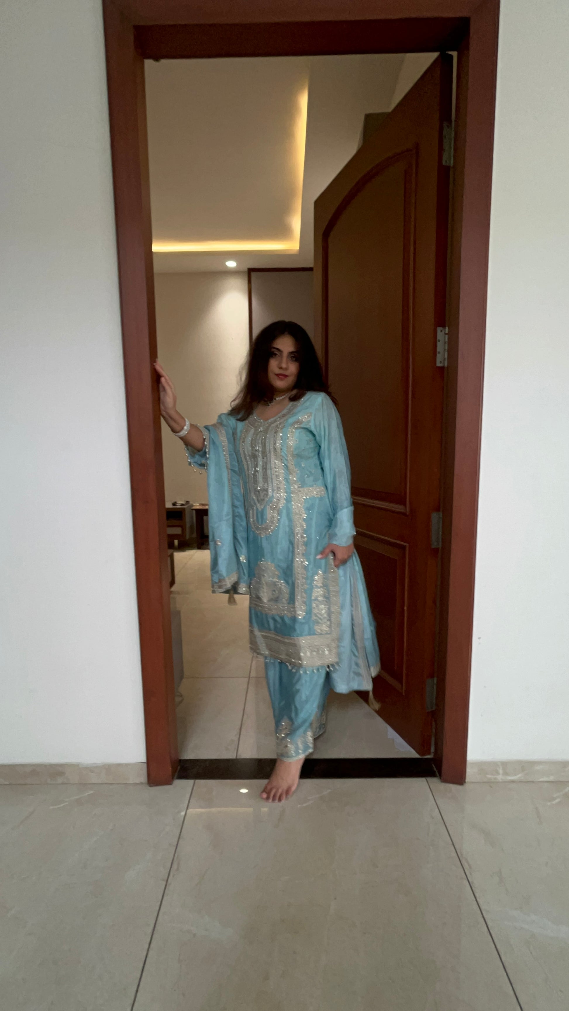 ✨ Kurta – Flowing royal blue silhouette featuring detailed silver embroidery or embellishments